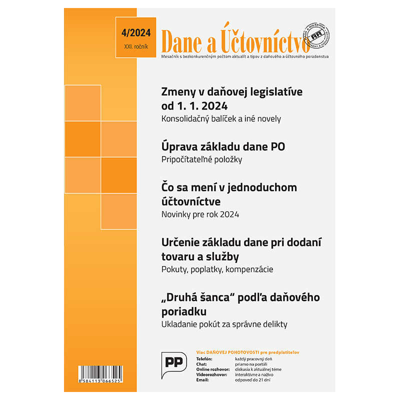 Marcové vydanie DaÚ obsahuje veľký prehľad zmien od 1. 1. 2024. Prejdeme si obsah konsolidačného balíčka, ale aj iných noviel daňových zákonov, predstavíme úpravy v postupoch pre jednoduché účtovníctvo, vysvetlíme princípy druhej šance pri uložení pokuty za osobitné správne delikty. K daňovým priznaniam prinášame rozsiahly príspevok o pripočítateľných položkách u právnických osôb. A miesto sme našli aj na zaujímavé témy z oblasti DPH – ako pokuty, poplatky, kompenzácie vstupujú do základu dane alebo ako sa posudzuje existencia prevádzkarne v niektorých špecifických prípadoch. Využite našu skratku k užitočnému prehľadu informácií, ktoré sa vám v tomto roku zídu.